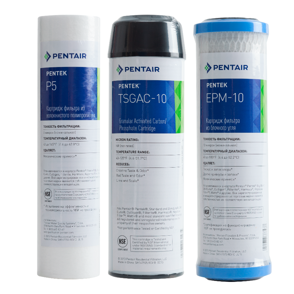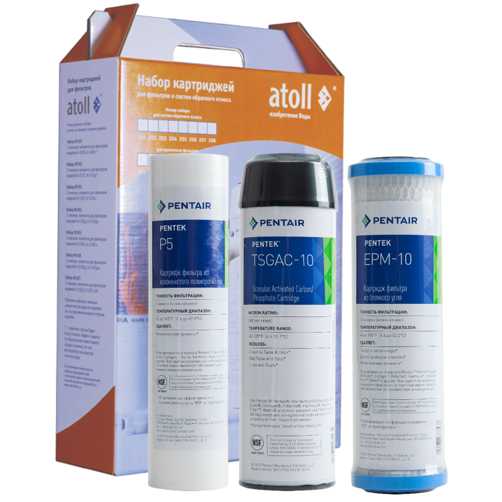 Полный набор картриджей Atoll №304 STD предназначен для замены использованных элементов в проточных питьевых системах. Содержит три предфильтра. Подходит для моделей A-313Еg/D-31s, A-313Eru.  Рекомендуемый срок замены: 6 месяцев. Набор картриджей Atoll №304 STD: картридж Pentair (Pentek) P5 (полипропилен) для очистки воды от механических примесей. Обладает высокой устойчивостью к воздействию бактерий и химикатов. Задерживает частицы размером более 5 мкм; Картридж Pentair (Pentek) TSGAC10 (гранулированный уголь с гексаметафосфатом) предназначен для улучшения органолептических свойств воды, удаления хлора. За счет добавления гексаметафосфата предотвращает размножение бактерий внутри фильтра; Картридж Pentair (Pentek) EPM-10 (прессованный активированный уголь) предназначен для устранения механических примесей. Задерживает частицы размером крупнее 10 мкм. Улучшенные показатели очистки от хлора. Назначение:  Набор предназначен для использования входящих в его комплект картриджей для периодической замены использованных элементов в проточных питьевых системах торговой марки atoll. Все сменные фильтрующие элементы, входящие в этот набор, имеют стандартные типоразмеры, и могут быть использованы для большинства фильтров других производителей. Внимание! Применение в фильтрах atoll картриджей сторонних производителей не обеспечивает характеристик, заявленных в паспорте на фильтр. Использование несертифицированных картриджей или картриджей неустановленных производителей может нанести вред Вашему здоровью.  Описание:  Отличительной особенностью фильтров для питьевой воды atoll и систем обратного осмоса atoll является использование картриджей, произведенных в США и сертифицированных NSF в соответствии с международными стандартами. Наличие такого сертификата говорит о том, что в картриджах использованы материалы, соответствующие самым строгим санитарным нормам. Этим гарантируется высокое качество очистки воды и отсутствие побочных эффектов в виде привнесенных в воду примесей. Подбор типов картриджей для каждой модели фильтра осуществляется с учетом особенностей состава воды.  Срок службы картриджей:  Срок службы каждого картриджа, входящего в состав этого набора, зависит от его ресурса, установленного производителем. Как правило, при очистке воды в условиях городского водоснабжения, и потребления очищенной воды семьей из 4 человек, картриджи имеют существенный запас (до 50%) по ресурсу. Однако настоятельно рекомендуется не превышать рекомендованные сроки замены картриджей, указанные в паспортах на устройства очистки воды. Особенно это касается тех случаев, когда фильтр не использовался в режиме очистки в течение длительного срока.