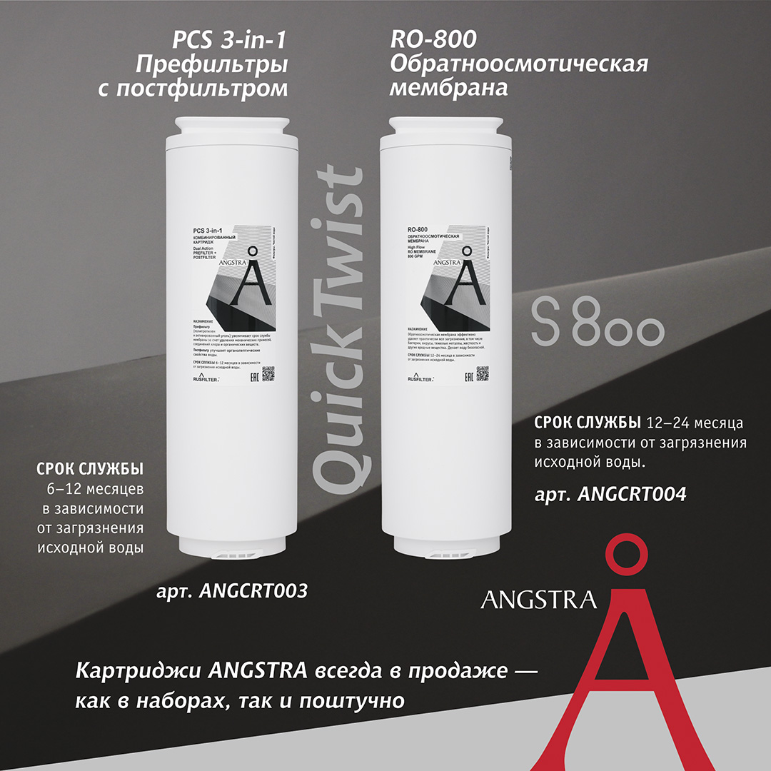 - Сверхмощная обратноосмотическая мембрана Angstra S-800 производит до 2-х литров чистой питьевой воды в минуту.