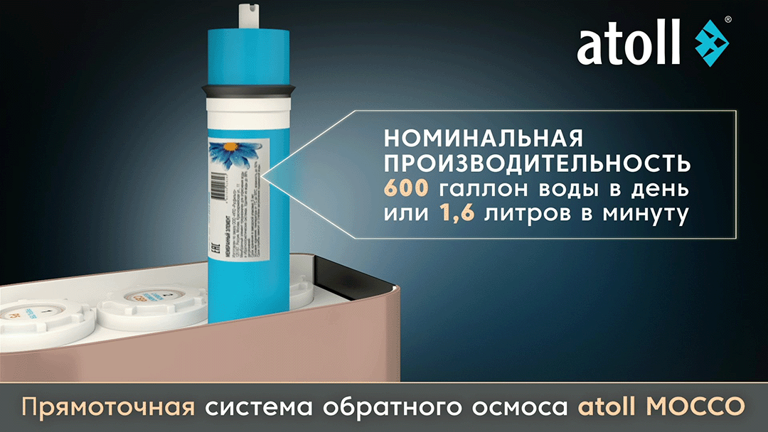 - Обратноосмотическая мембрана atoll имеет в 12 раз более высокую производительность 600 GPD до 1,6 л/мин – тестировалась в сравнении с FILMTEC, эталонной мембраной на мировом рынке. Стандартный типоразмер мембраны TW20-2813 совместим со многими системами коммерческого розлива питьевой воды.
