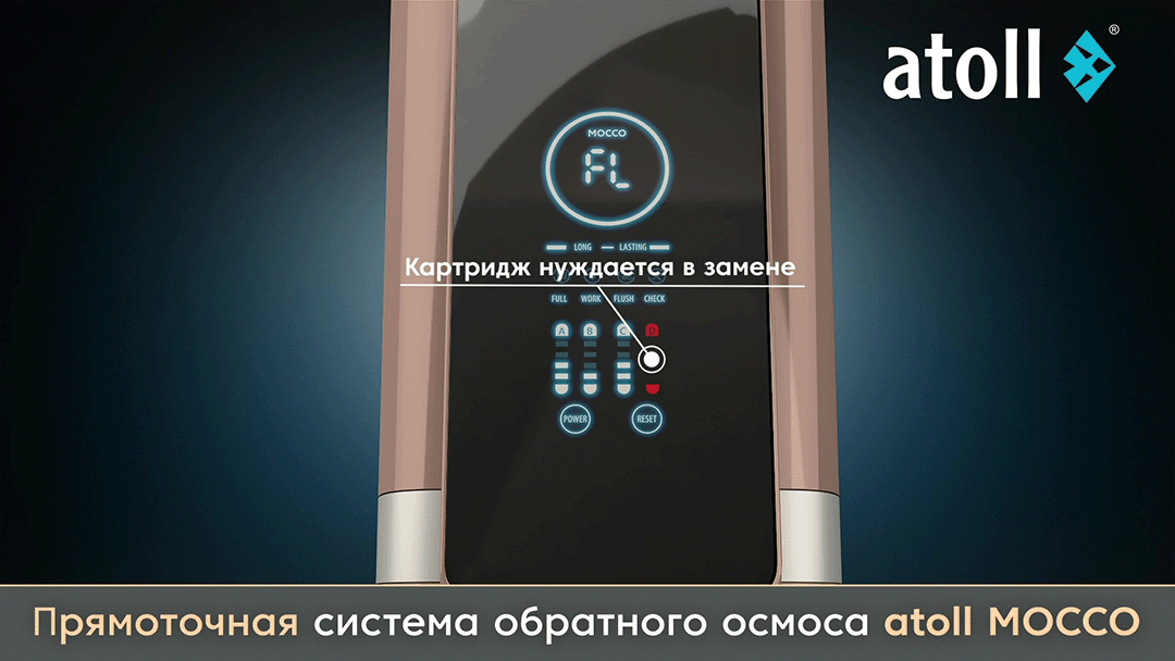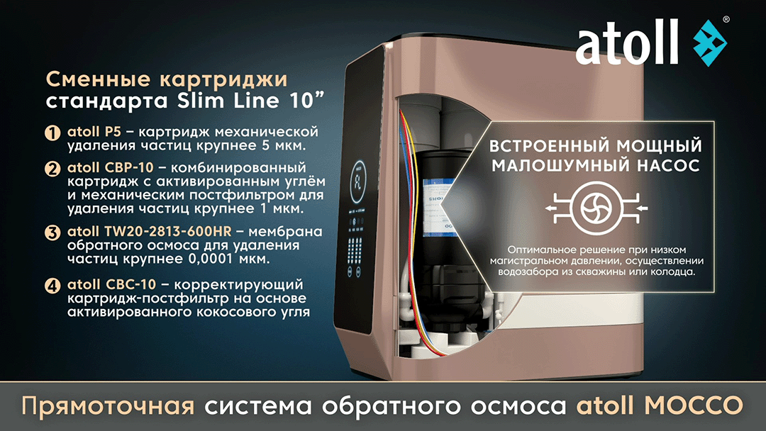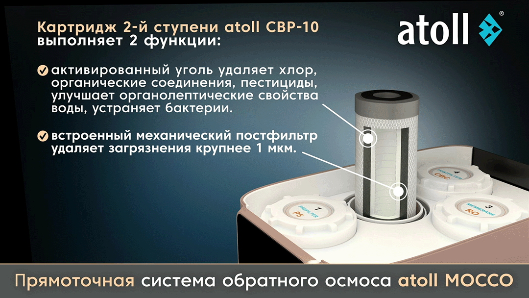 - В системе 4 ступени очистки, полноценно выполняющие 5 функций. Уникальный комбинированный картридж 2-ой ступени atoll CBP-10 одновременно осуществляет глубокую сорбционную очистку, антибактериальную очистку и тонкую механическую постфильтрацию (1 микрон).
