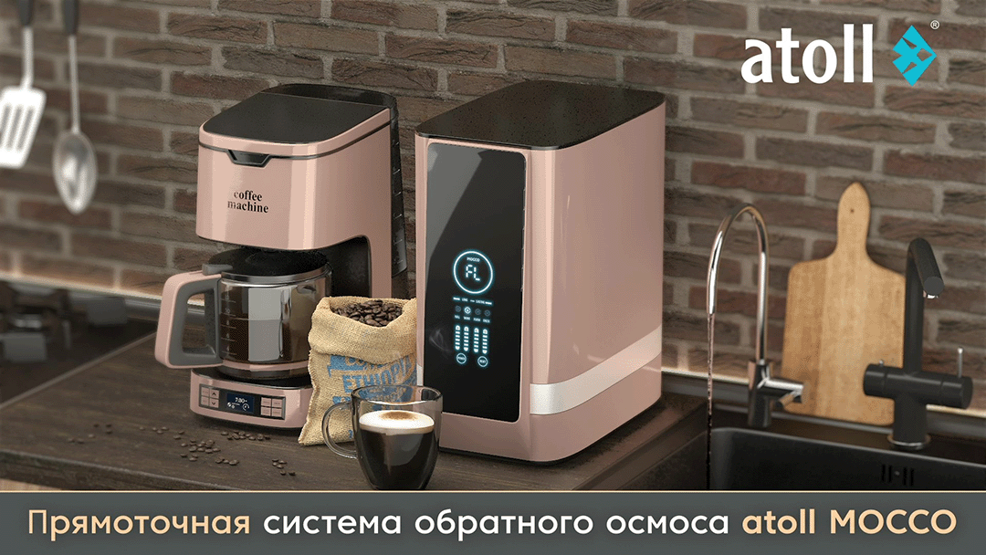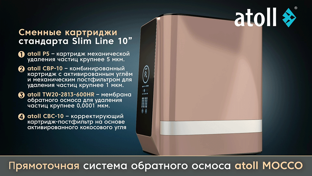 - 4-я ступень - atoll CBC-10 — корректирующий картридж-постфильтр на основе активированного кокосового угля;