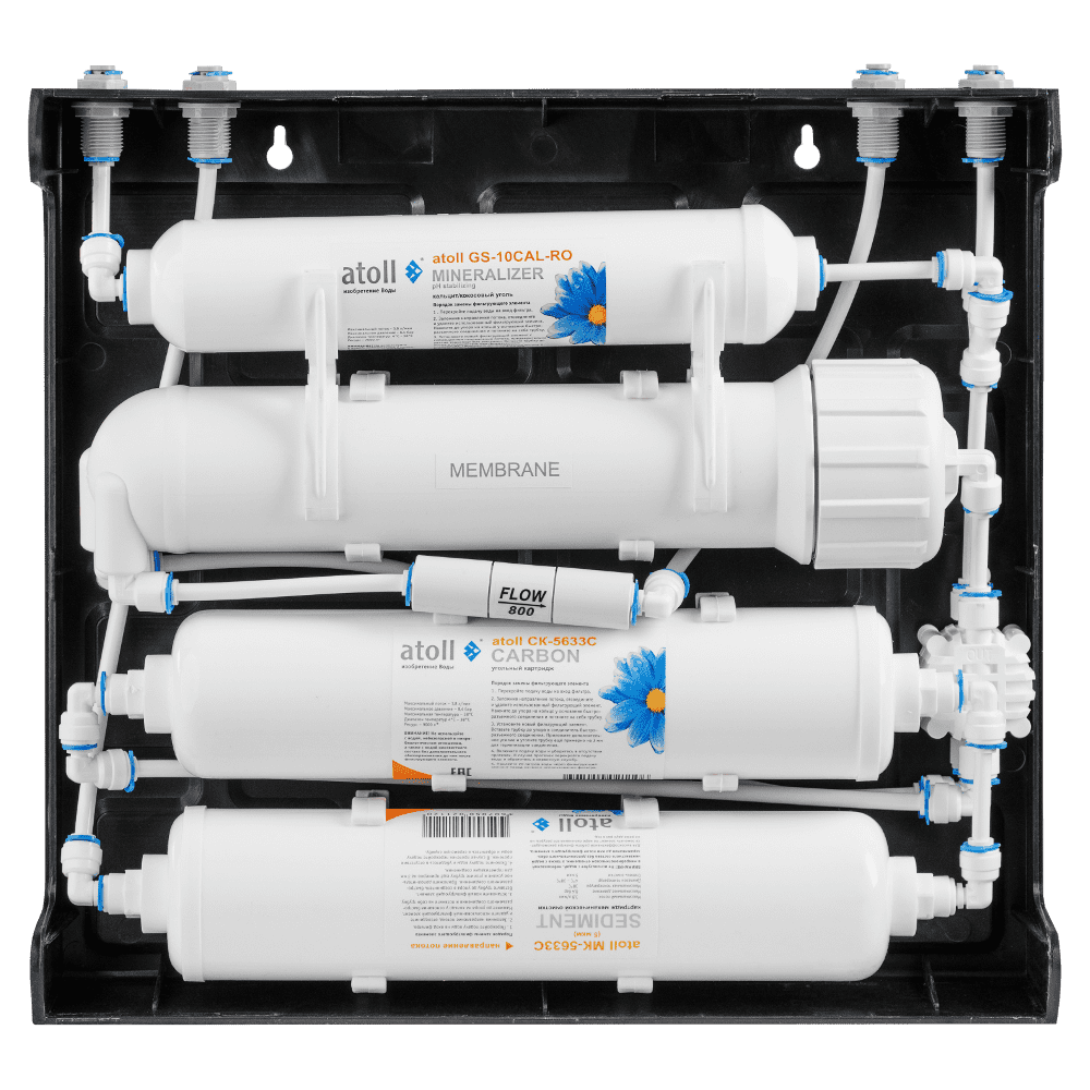 - постфильтром-минерализатором atoll GS-10CAL-RO, который на финишной очистке улучшает вкус воды и увеличивает содержание полезных микроэлементов в очищенной воде.